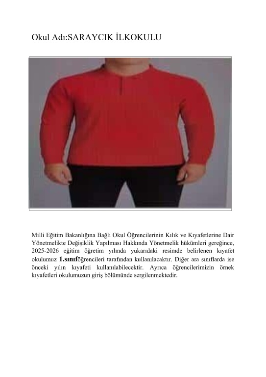 2025-2026 Eğitim Öğretim Yılında kullanılacak olan öğrenci kıyafetleri Okul Aile Birliği tarafından üst kırmızı alt siyah olarak belirlenmiştir.